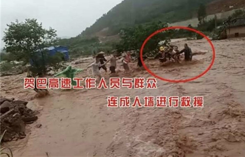 7月3日,廣西桂北地區連日遭受暴雨侵襲,鐘山至昭平高速公路項目多個場站被沖毀,駐地被洪水圍困,項目部立即啟動應急救援預案,積極開展自救工作。在得知附近的源頭鎮群眾被洪水圍困后,項目工區經理鄒穎林立刻放下整理好的物資,與其他員工一起沖進洪水中拯救鄉民。項目部員工通過手拉手搭建起了生命通道,先后4次下水施救,最終成功轉移30多名受困群眾,其中包括5名小孩。