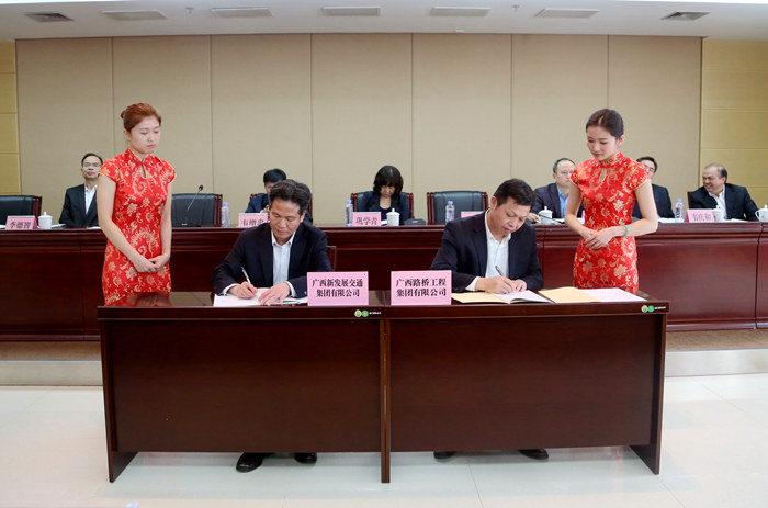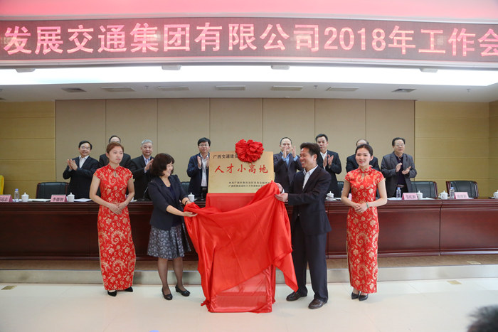 會后,自治區(qū)國資委副巡視員鞏學(xué)青與集團(tuán)公司黨委書記、董事長朱堅和一同為集團(tuán)公司“廣西交通建設(shè)人才小高地”揭牌。