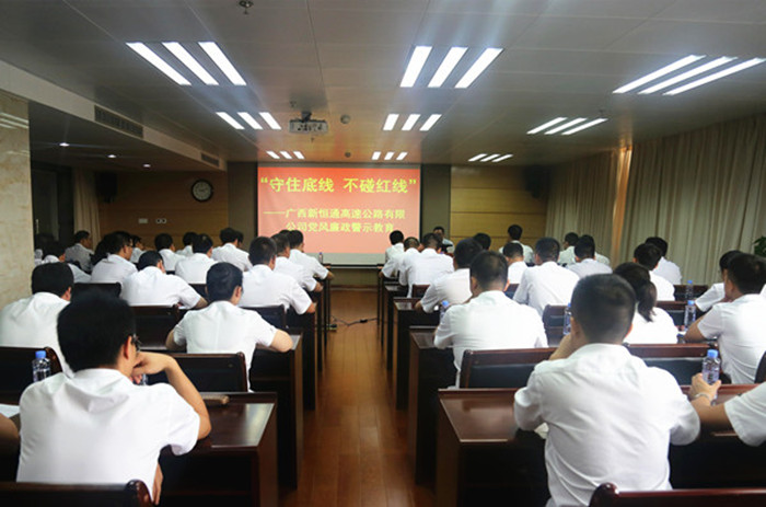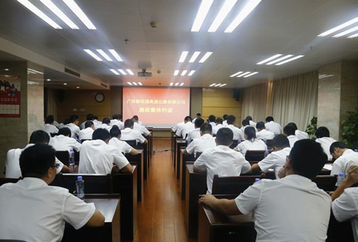 活動上,新恒通公司黨委書記、董事長賴水平還對與會人員進行了廉政集體約談。賴水平感謝吳雄飛老師給大家上了一堂別開生面的廉政警示教育課,作為交通基礎設施建設行業(yè)的業(yè)主單位,在廉潔從業(yè)的道路上,他提出幾點要求和期望:一是加強學習,提升道德修養(yǎng),堅定理想信念;二是嚴于律己,規(guī)范作風行為,筑牢防腐堤壩;三是嚴以用權(quán),增強廉政意識,緊守從業(yè)底線;四是守土有責,堅持“一崗雙責”,深化責任落實。賴水平強調(diào),廣西交通基礎設施建設正處于大有可為、大有作為的歷史機遇期,面對紛繁復雜的形勢,全體黨員干部要在黨的十九大精神的指引下,緊緊圍繞公司總體工作思路和目標,統(tǒng)一思想,堅定信念,持續(xù)加強作風建設,堅決把紀律挺在前面,耳邊常響廉潔警鐘,心中常筑反腐防線,用廉潔從業(yè)的實際行動為公司“縣縣通”高速公路建設事業(yè)的發(fā)展保駕護航。